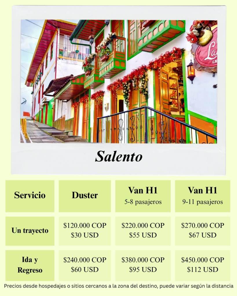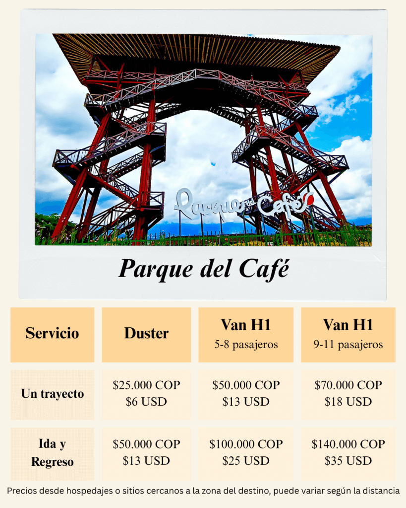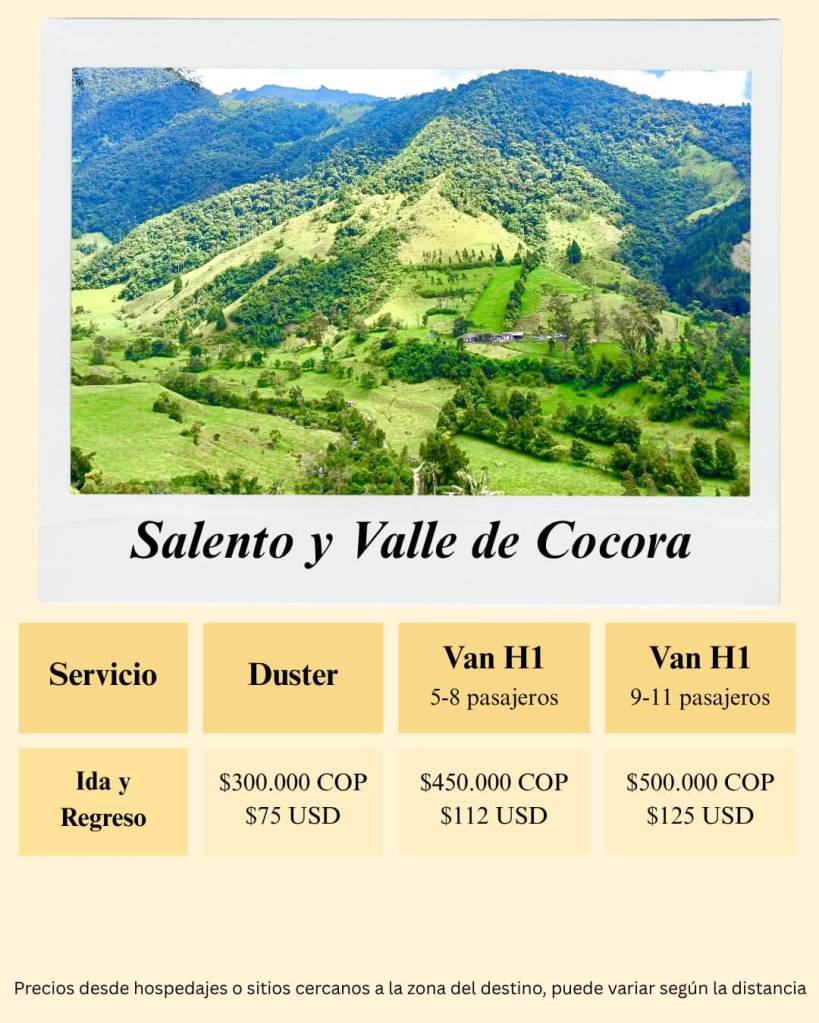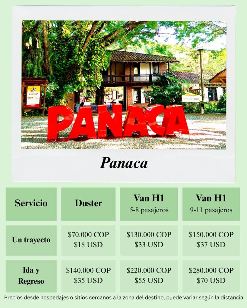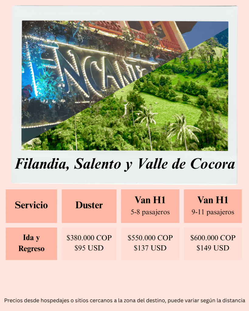 Estos son algunos de los destinos más comunes en el Eje Cafetero, sin embargo debes tener en cuenta que estas tarifas pueden variar dependiendo de la lejanía al lugar de destino (alrededor de los 5 kilómetros) y al número de pasajeros, por lo tanto contáctanos para realizar una cotización acorde a tus necesidades.